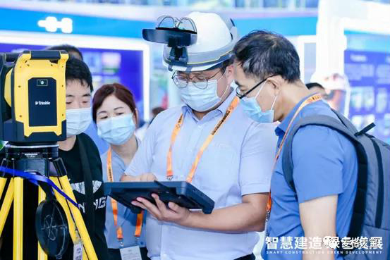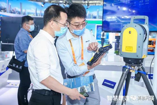 展台陈列:BIM放样机器人、三维激光扫描仪、混合现实头盔等。